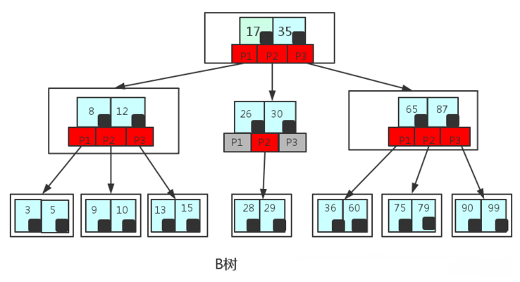 (3)应用 1、广泛用于C++的STL中,Map和Set都是用红黑树实现的; 2、著名的Linux进程调度Completely Fair Scheduler,用红黑树管理进程控制块,进程的虚拟内存区域都存储在一颗红黑树上,每个虚拟地址区域都对应红黑树的一个节点,左指针指向相邻的地址虚拟存储区域,右指针指向相邻的高地址虚拟地址空间; 3、IO多路复用epoll的实现采用红黑树组织管理sockfd,以支持快速的增删改查; 4、Nginx中用红黑树管理timer,因为红黑树是有序的,可以很快的得到距离当前最小的定时器; 5、Java中TreeMap的实现; 四、B/B+树 说了上述的三种树:二叉查找树、AVL和红黑树,似乎我们还没有摸到MySQL为什么要使用B+树作为索引的实现,不要急,接下来我们就先探讨一下什么是B树。 (1)简介 我们在MySQL中的数据一般是放在磁盘中的,读取数据的时候肯定会有访问磁盘的操作,磁盘中有两个机械运动的部分,分别是盘片旋转和磁臂移动。盘片旋转就是我们市面上所提到的多少转每分钟,而磁盘移动则是在盘片旋转到指定位置以后,移动磁臂后开始进行数据的读写。那么这就存在一个定位到磁盘中的块的过程,而定位是磁盘的存取中花费时间比较大的一块,毕竟机械运动花费的时候要远远大于电子运动的时间。当大规模数据存储到磁盘中的时候,显然定位是一个非常花费时间的过程,但是我们可以通过B树进行优化,提高磁盘读取时定位的效率。 为什么B类树可以进行优化呢?我们可以根据B类树的特点,构造一个多阶的B类树,然后在尽量多的在结点上存储相关的信息,保证层数尽量的少,以便后面我们可以更快的找到信息,磁盘的I/O操作也少一些,而且B类树是平衡树,每个结点到叶子结点的高度都是相同,这也保证了每个查询是稳定的。 总的来说,B/B+树是为了磁盘或其它存储设备而设计的一种平衡多路查找树(相对于二叉,B树每个内节点有多个分支),与红黑树相比,在相同的的节点的情况下,一颗B/B+树的高度远远小于红黑树的高度(在下面B/B+树的性能分析中会提到)。B/B+树上操作的时间通常由存取磁盘的时间和CPU计算时间这两部分构成,而CPU的速度非常快,所以B树的操作效率取决于访问磁盘的次数,关键字总数相同的情况下B树的高度越小,磁盘I/O所花的时间越少。