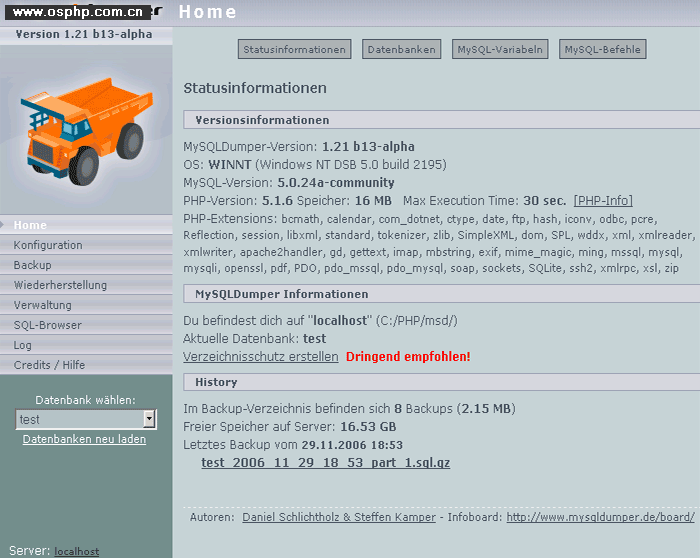 MySQLDumper是常用MySQL图 形化管理工具之一。MySQLDumper使用PHP开发的MySQL数据库备份恢复程序,解决了使用PHP进 行大数据库备份和恢复的问题,数百兆的数据库都可以方便的备份恢复,不用担心网速太慢导致中间中断的问题,非常方便易用。这个软件是德国人开发的,还没有 中文语言包。
