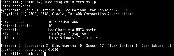 或者,运行下列mysqladmin命令以查找MySQL服务器的正常运行时间。