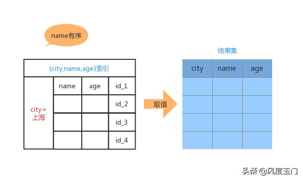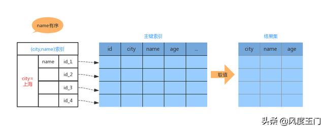 从上面流程图可以看出,当我们取出 city='上海' 的记录时,name的字段也是有序的。过程如下