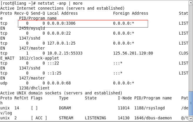 其中mysqld.log 这个文件就是存放我们跟mysql数据库进行操作而产生的一些日志信息,通过查看该日志文件,我们可以从中获得很多信息 我们都知道mysql数据库绑定的端口号是 3306 ,所以我们可以通过 netstat -anp 命令来查看一下,Linux系统是否在监听 3306 这个端口号: