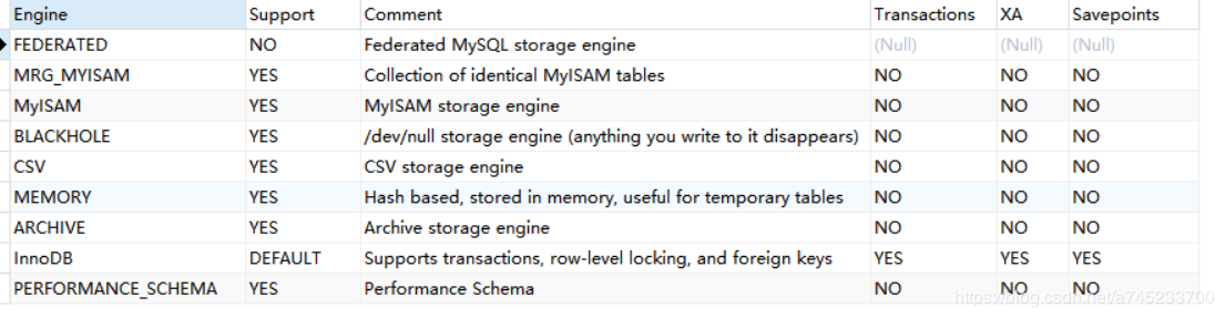 Support列的值表示某种引擎是否能使用:YES表示可以使用、NO表示不能使用、DEFAULT表示该引擎为当前默认的存储引擎 。