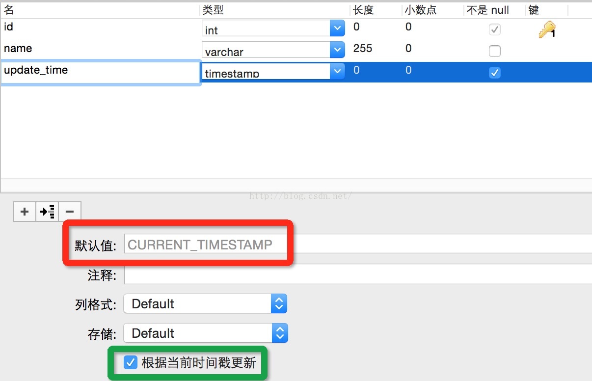 如果使用Navicat建表就是在图绿框中勾选上根据当前时间戳更新