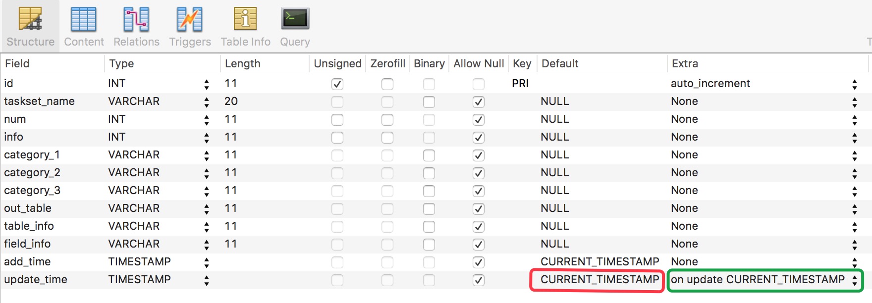 `update_time` timestamp NOT NULL ON UPDATE CURRENT_TIMESTAMP DEFAULT CURRENT_TIMESTAMP,