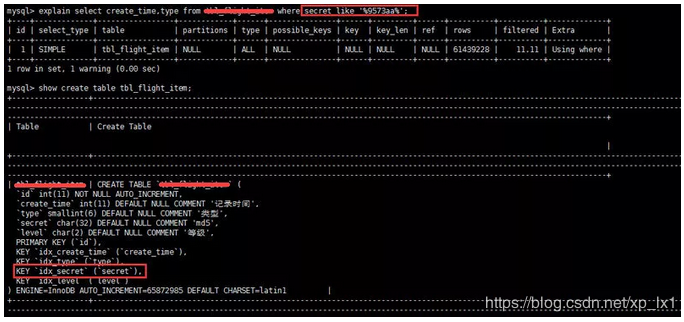 如下图所示,虽然给secret字段添加了索引,但在explain结果果并没有使用