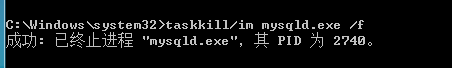 4、如果资源管理器关闭不了 可以使用taskkill /im mysqld.exe /f ;这里的mysqld.exe是你要关闭的进程名字;/f是强制关闭的意思