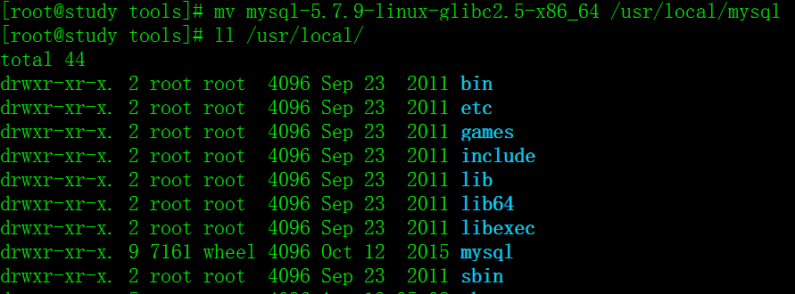 2.改名并移动:mv mysql-5.7.9-linux-glibc2.5-x86_64 /usr/local/mysql