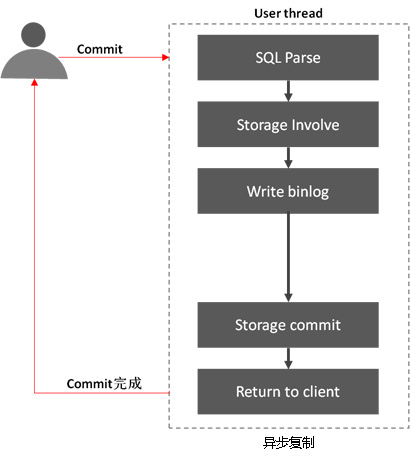 图4 异步复制 【MySQL半同步复制】 到了MySQL 5.5版本的时候,Google提供了一个半同步半异步的插件,确保必须收到一个备机的应答才让事务在主机中提交;当备机应答超时的情况下,强同步就会自动退化成异步模式(这也是半同步半异步名字的由来)。