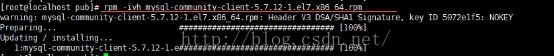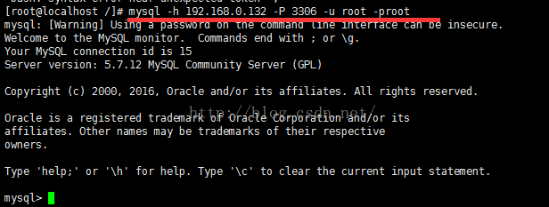 rpm -ivh mysql-community-client-5.7.12-1.el7.x86_64.rpm安装包,然后,在命令行下输入:mysql -h 192.168.0.132 -P 3306 -u root -proot,显示登录成功。