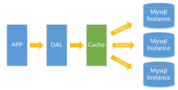 只有当以上3件事情任何一件或多件满足时,我们才需要考虑往下一级演变。 从此我们可以看出,事实上对于很多小公司小应用,这种架构已经足够满足他们的需求了,初期数据量准确评估是杜绝过度设计很重要的一环,毕竟没有人愿意为不可能发生的事情而浪费自己的精力。 这里简单举个我的例子,对于用户信息这类表 (3个索引),16G内存能放下,大概2000万行数据的索引,简单的读和写混合访问量3000/s左右没有问题,你的应用场景是否? V2.0 垂直拆分一般当V1.0 遇到瓶颈时,首先最简便的拆分方法就是垂直拆分,何谓垂直?就是从业务角度来看,将关联性不强的数据拆分到不同的Instance上,从而达到消除瓶颈的目标。以图中的为例,将用户信息数据,和业务数据拆分到不同的三个实例上。对于重复读类型比较多的场景,我们还可以加一层Cache,来减少对DB的压力。