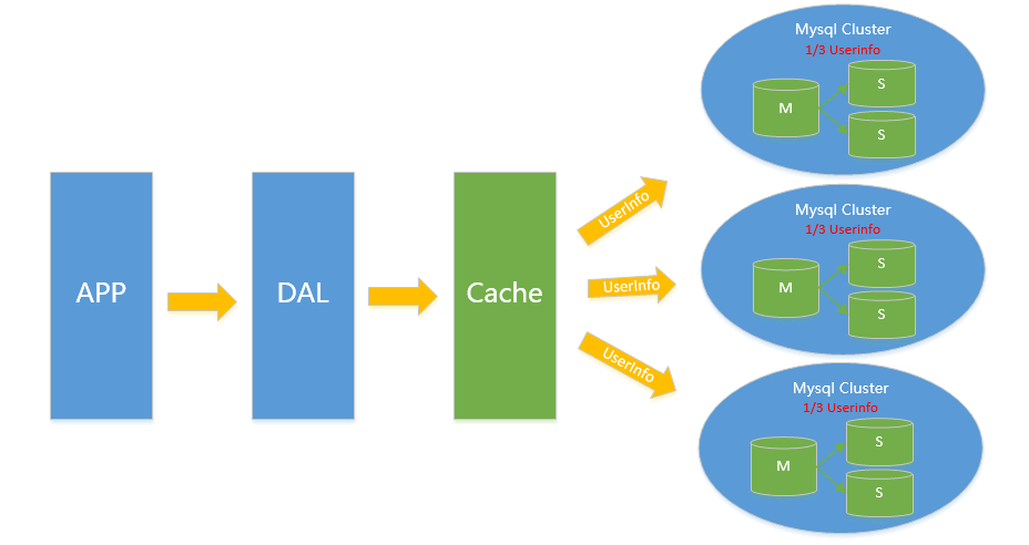 在这样的架构下,我们来看看数据存储的瓶颈是什么?很明了,写入量主库不能承受。 V4.0 水平拆分对于V2.0、V3.0方案遇到瓶颈时,都可以通过水平拆分来解决,水平拆分和垂直拆分有较大区别,垂直拆分拆完的结果,在一个实例上是拥有全量数据的,而水平拆分之后,任何实例都只有全量的1/n的数据,以下图UserInfo的拆分为例,将UserInfo拆分为3个Cluster,每个Cluster持有总量的1/3数据,3个Cluster数据的总和等于一份完整数据。 注:这里不再叫单个实例 而是叫一个Cluster 代表包含主从的一个小MySQL集群。
