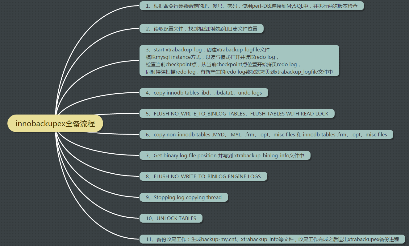因为innobackupex是物理拷贝文件,数据并不像mysqldump那样通过对数据库表执行select语句查询进行备份,而是通过拷贝磁盘文件进行备份的,所以,主体的备份流程还需要看strace的调用栈,限于篇幅原因,详见这里。