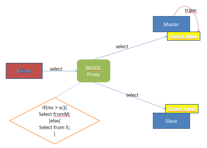由于数据延迟问题的存在,当应用程序在Master 上进行数据更新,然后又立刻需要从数据库中读取数据时,这时候如果应用程序从Slave上取数据(这也是当前Web开发的常规做法),就可能出现读取不到期望的数据,造成程序运行异常。 解决这个问题有多种方式,比如最简单的在所有的insert和update之后,强制sleep几秒钟。这是非常粗鲁的方式,对于更新操作不是很高的中小型系统,此方式基本能解决问题。 另外一种方式是应用程序把被更新的数据保存在本机的内存(或者集中式缓存)中,如果在写入数据完成后需要直接读取数据,则从本机内存中读取。这种方式的缺点是极大的增加了应用程序的复杂度,而且可靠性并不能完全得到保障。 使用MySQL Proxy可以很方便的解决这个问题。MySQL Proxy是基于MySQL Client 和 MySQL Server之间的代理程序,能够完成对Client所发请求的监控、修改。从Client角度看,通过Proxy访问Server和直接访问 Server没有任何区别。对于既有的程序而言,只要把直接被访问的Server的IP地址和端口号换成Proxy的IP地址和端口号就可以。 MySQL Proxy的工作原理也较简单。在Proxy启动时可以指定Proxy所需要使用的lua脚本,在lua脚本中预先实现6个方法: * connect_server() // 接收到Client的连接请求时调用 * read_handshake() // * read_auth() // 读取Client的认证信息时调用 * read_auth_result() // 读取认证结果时调用 * read_query() // 读取Client的query请求时调用 * read_query_result() //读取query结果时调用 当 Proxy接收到Client请求时,在请求的不同的阶段会调用上面的不同方法。这样Proxy使用者就可以根据自己的业务需求,自由的实现这6个方法达到目的。 通过在read_query()中加入代码,我们可以截取出当前的请求是insert、update还是select,然后把 insert和update请求发送到Master中,把select请求发送到Slave中,这样就解决了读写分离的问题。 在解决了读写分离后,如何解决同步延迟呢? 方法是在Master上增加一个自增表,这个表仅含有1个的字段。当Master接收到任何数据更新的请求时,均会触发这个触发器,该触发器更新自增表中的记录。如下图所示: mysql_proxy_write 由于Count_table也参与Mysq的主从同步,因此在Master上作的 Update更新也会同步到Slave上。当Client通过Proxy进行数据读取时,Proxy可以先向Master和Slave的 Count_table表发送查询请求,当二者的数据相同时,Proxy可以认定 Master和Slave的数据状态是一致的,然后把select请求发送到Slave服务器上,否则就发送到Master上。如下图所示: mysql_proxy_read 通过这种方式,就可以比较完美的结果MySQL的同步延迟不可控问题。之所以所“比较完美”,是因为这种方案double了查询请求,对 Master和Slave构成了额外的压力。不过由于Proxy与真实的Mysql Server采用连接池的方式连接,因此额外的压力还是可以接受的。 |