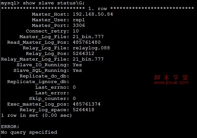Slave_SQL_Running: Yes Master_Log_File: bin-log.003 Relay_Master_Log_File: bin-log.003 Read_Master_Log_Pos: 4 Exec_master_log_pos: 4 Seconds_Behind_Master: 0(5.0之前版本没有这个选项) 以上选项是两两对应的,只要结果是一致的,就说明主从同步成功。