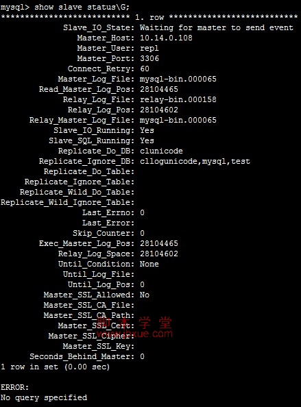 master-host=192.168.1.2 master-user=repl master-password=1q2w3e4r master-port=3306 master-connect-retry=30 slave-skip-errors=1062 replicate-do-db = adb replicate-ignore-db = mysql slave-skip-errors=1007,1008,1053,1062,1213,1158,1159 master-info-file = /home/mysql/logs/master.info relay-log = /home/mysql/logs/relay-bin relay-log-index = /home/mysql/logs/relay-bin.index relay-log-info-file = /home/mysql/logs/relay-log.info 如果修改了连接主库相关信息,重启之前一定要删除master.info文件,否则重启之后由于连接信息改变从库而不会自动连接主库,造成同步失败。此文件是保存连接主库信息的。