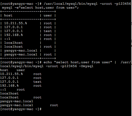 1、 MYSQL_HOME/bin/mysql -u用户名 -p密码 -D数据库名 -e"sql 语句" /usr/local/mysql/bin/mysql -uroot -p123456 -Dmysql -e"select host,user from user"; 2、 echo "sql 语句" | MYSQL_HOME/bin/mysql -u用户名 -p密码 -D数据库名 echo "select host,user from user" | /usr/local/mysql/bin/mysql -uroot -p123456 -Dmysql