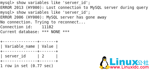 短暂的失去连接之后,再次连接上VIP,server_id已经变为2,说明VIP已经指向了Slave