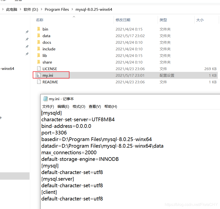 在解压后的mysql目录下面新建一个data的空文件夹,再在d:\program files\mysql-8.0.25-winx64下新建一个my.ini的配置文件。在该文件中写入以下代码: