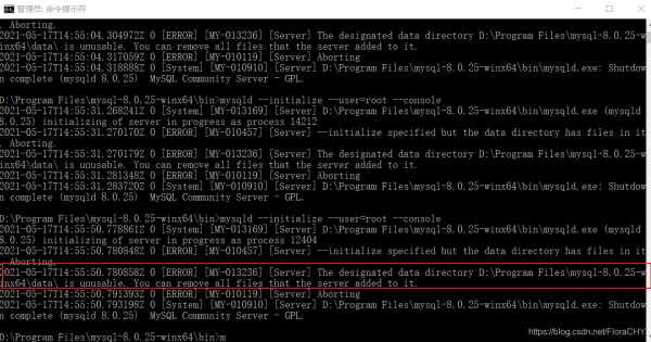 这里需要注意的一点,如果data文件不为空,则会报错:the designated data directory d:\program files\mysql-8.0.25-winx64\data\ is unusable. you can remove all files that the server added to it.