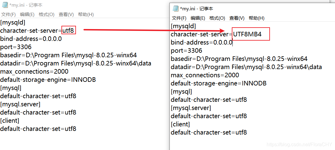 [mysqld] #设置服务端使⽤用的字符集为utf-8 character-set-server=utf8mb4 #绑定ipv4地址 bind-address=0.0.0.0 #设置mysql的端⼝口号 port = 3306 #设置mysql的安装⽬目录 basedir=f:/mysql-5.7.23 #设置mysql数据库的数据的存放⽬目录 datadir=c:/mysql-5.7.23/data #允许最⼤大连接数 max_connections=2000 #创建新表时将使⽤用的默认存储引擎 default-storage-engine=innodb #设置mysql以及数据库的默认编码 [mysql] default-character-set=utf8 [mysql.server] default-character-set=utf8 #设置客户端默认字符集 [client] default-character-set=utf8