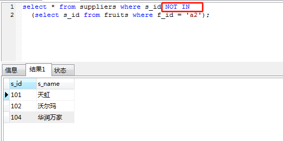 in 关键字进行子查询时,内层查询语句仅仅返回一个数据列,这个数据列的值将提供给外层查询语句进行比较操作。