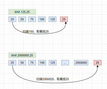 这种查询的慢,其实是因为limit后面的偏移量太大导致的。比如像上面的 limit 2000000,25 ,这个等同于数据库要扫描出 2000025条数据,然后再丢弃前面的 20000000条数据,返回剩下25条数据给用户,这种取法明显不合理。