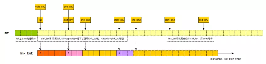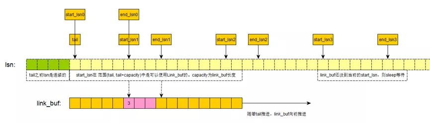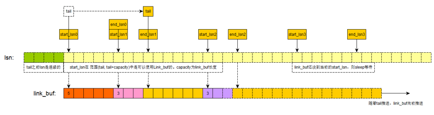 如图所示,start_lsn0-end_lsn0,start_lsn2-end_lsn2, start_lsn3-end_lsn3为三个用户线程新申请的lsn区间;start_lsn1-end_lsn1对应的区间已经标记到link_buf上;start_lsn3-end_lsn3距离tail太远,需要等待link_buf推进才能使用;