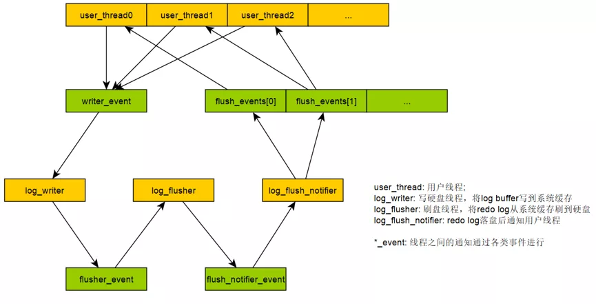 用户线程在读写事务提交时,会产生一些redo log,并随着mtr提交而记录到redo log buffer中,随后用户线程尝试设置writer_event触发log_writer线程写日志,并监听属于自己的flush_events[i]事件;