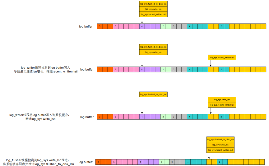 具体实现时,通过log_sys中的几个成员变量,跟进redo log的写入情况。其中log_sys.recent_writtern.m_tail表示log buffer最大连续范围;log_sys.write_lsn表示写入到系统缓存的位置;log_sys.flushed_to_disk_lsn表示已落盘的位置。各标记的推进过程如下: