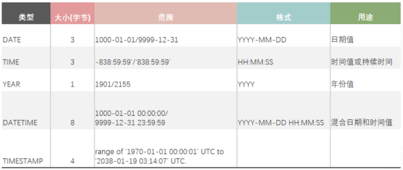 - timestamp 如果没有显式地使用null属性或显式默认属性声明,则自动声明为默认的'0000-00-00 00:00:00'(“零”时间戳)