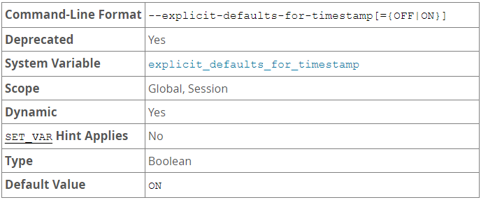 - 没有使用not null属性显式声明的timestamp列将自动使用null属性声明并允许空值。