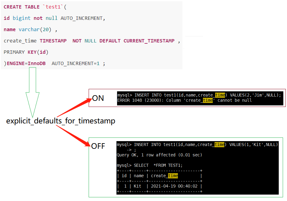 create table `test1`( id bigint not null auto_increment comment '主键id', name varchar(20) comment '主键id', create_time timestamp not null default current_timestamp comment 'cr time', primary key(id) )engine=innodb auto_increment=1 ; show variables like 'explicit_defaults_for_timestamp'; set global explicit_defaults_for_timestamp=on; set global explicit_defaults_for_timestamp=off; insert into test1(id,name,create_time) values(1,'kit',null);
