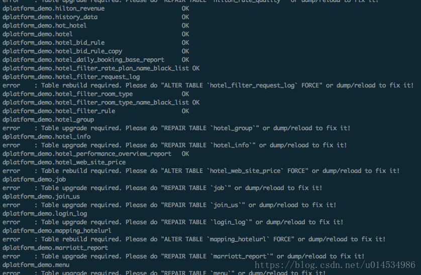 可能会有一些error提示"alter table ** froce",这些错误不用担心mysql在后面会自动修复repair的时间可能会有点长,要看你的数据库情况,我这次升级花了两个多小时