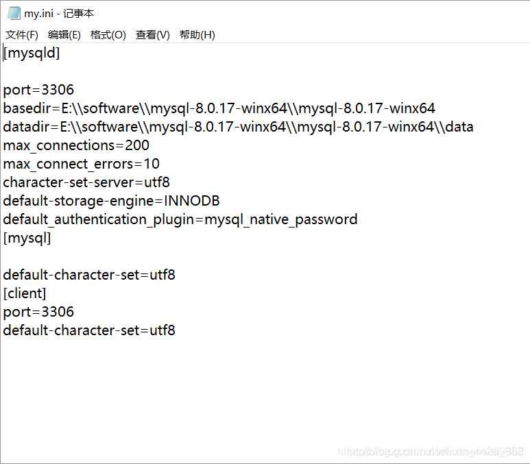 注意:windows默认新建的是txt文件,需要修改后缀名为 ini。 同时注意my.ini配置文件的编码规则必须是ansi,否则运行安装代码的时候会报错。