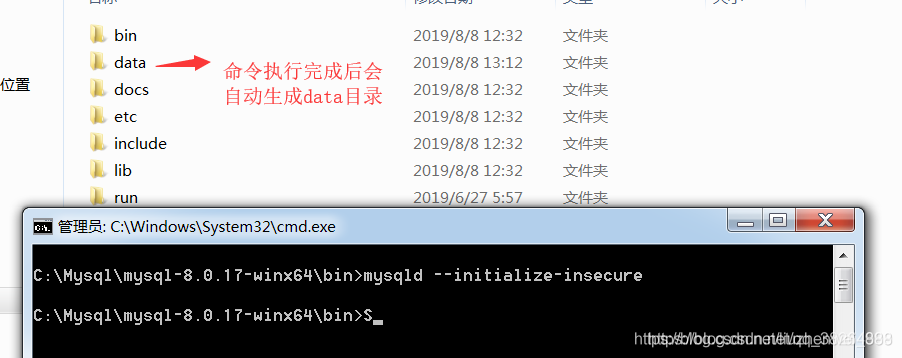 5.初始化mysql,mysql8.0之后自动生成data文件夹。下面的代码两者选择自己合适的一个。