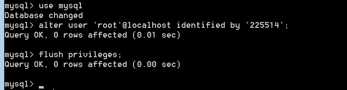 //切换数据库 use mysql; //修改root用户的密码为225514,根据需要自己设置 alter user 'root'@localhost identified by '225514'; //刷新权限,一般修改密码或授权用户的时候需要使用 flush privileges; //推出mysql,两个都可以正常退出数据库 quit exit