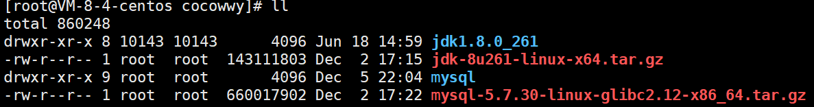 接下来我们可以看到你在自己的/usr/local/cocowwy下已经存在mysql,注意本人的路径是cocowwy,如果有此时正在看的你使用的是其他的路径,请把这个文件夹改成你自己的,之后引用到此路径的地方都请自行更改,不要盲目复制。