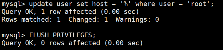 update user set host = '%' where user = 'root'; #使root能再任何host访问