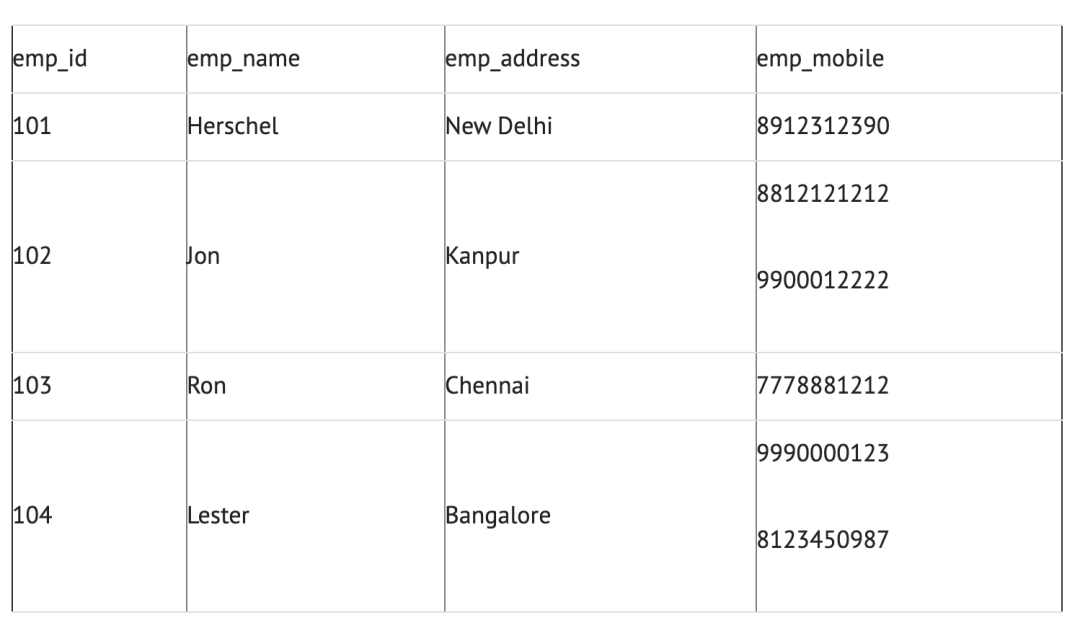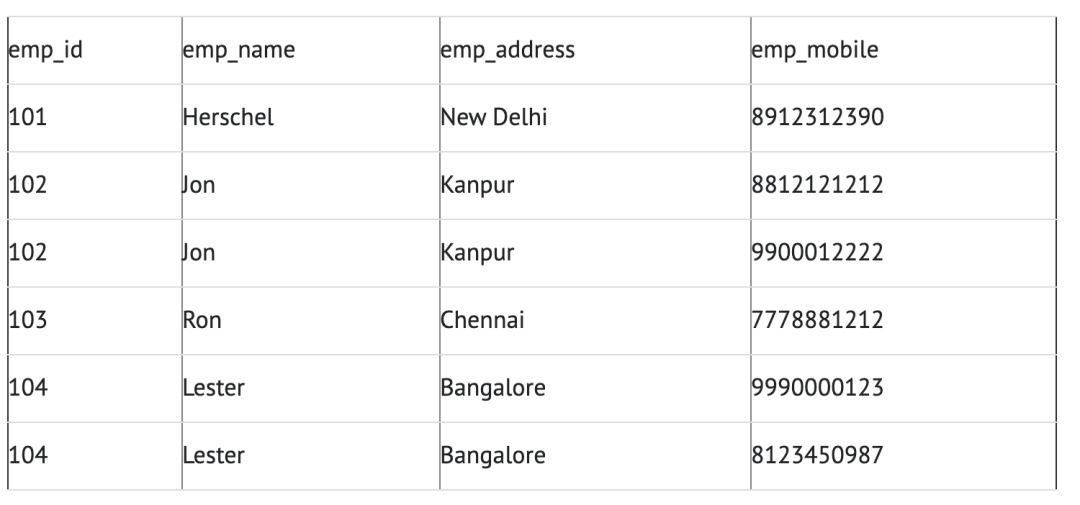 两名员工(jon&lester)拥有两个手机号码,因此公司将他们存储在同一表格中,如上表所示。那么该表不符合 1nf ,因为规则说“表的每个属性必须具有原子(单个)值”,jon&lester员工的 emp_mobile 值违反了该规则。为了使表符合 1nf ,我们应该有如下表数据: