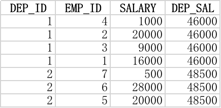 返回所有员工数据,并返回其所在部门的工资总和,因此同一部门员工的dep_sal字段值是一样的。