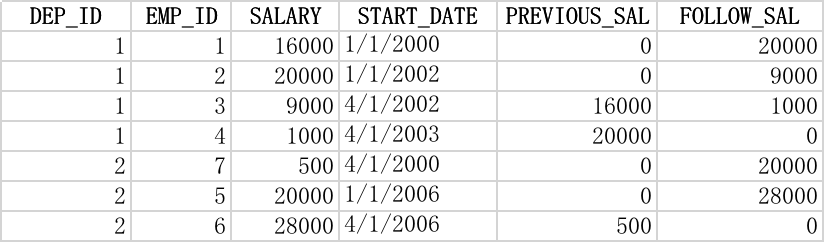 lead(salary, 2, 0) OVER (PARTITION BY dep_id order by start_date ) follow_sal