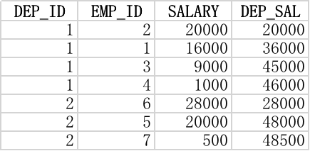 下面query结果有很大不同,由于加入了order by子句,同一部门员工的dep_sal不再相同,而是按salary排序后到该员工的累计总额。