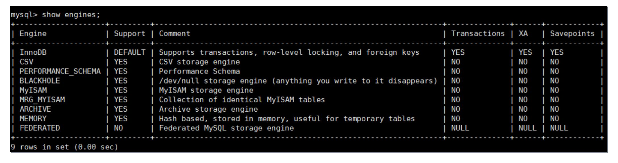 - 使用MySQL命令“show engines;" 即可查看MySQL服务实例