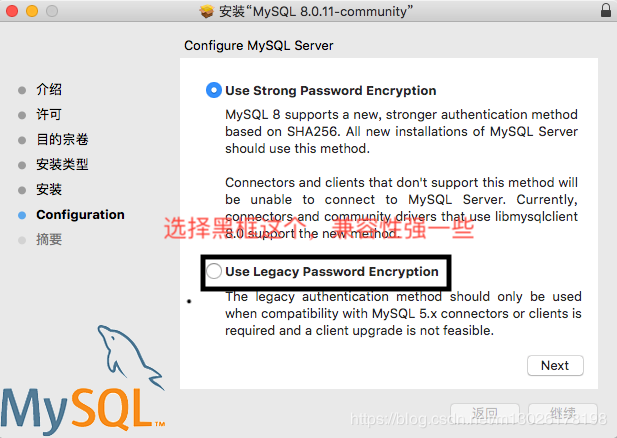 在安装界面上一路继续,直到遇到密码配置问题,选择兼容性强的Legcy PasswordEncryption