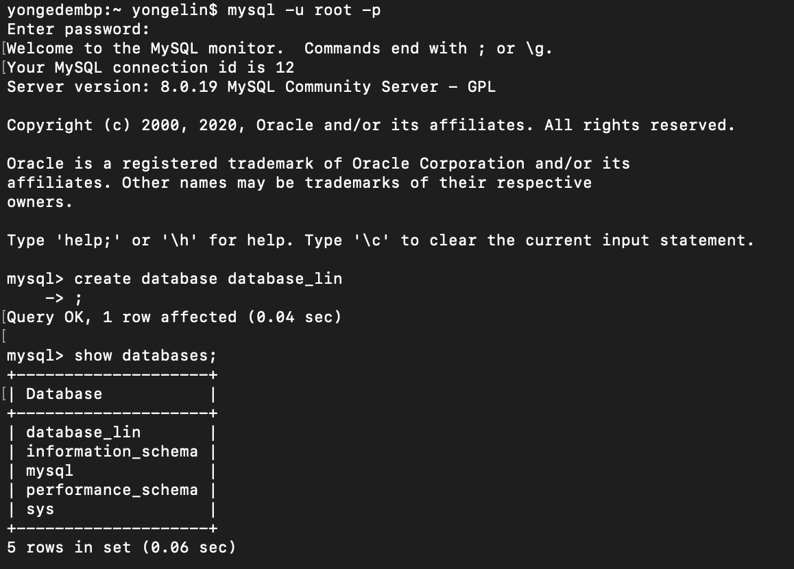 ? 接着输入 mysql -u root -p ,回车,然后输入在前文提到的 MySQL 的初始密码,输完之后回车,进入如下界面: