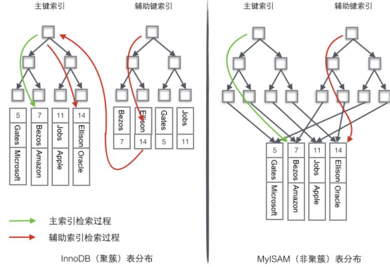 - 主键索引采用聚集索引(索引的数据域存储数据文件本身),辅索引的数据域存储主键的值;因此从辅索引查找数据,需要先通过辅索引找到主键值,再访问主键索引;最好使用自增主键,防止插入数据时,为维持B+树结构,文件的大调整。