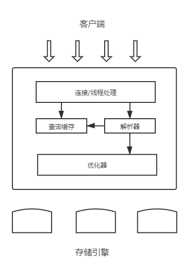 查询解析、分析、优化、缓存以及所有的内置函数(例如,日期、时间、数学和加密函数),所有跨存储引擎的功能都在这一层实现:存储过程、触发器、视图等。