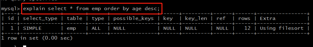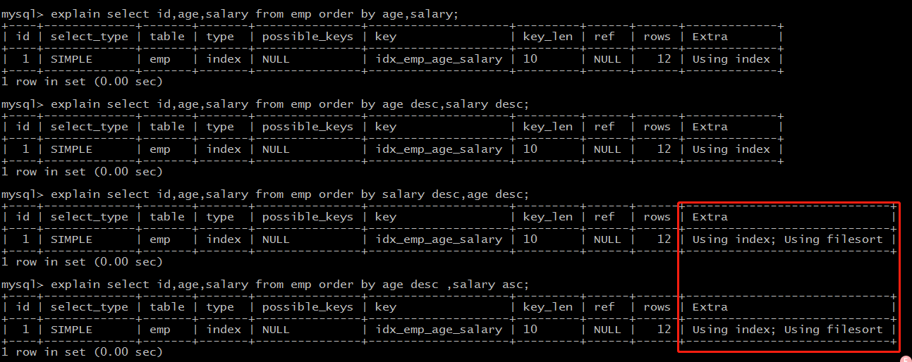 explain select id,age,salary from emp order by age desc,salary desc;