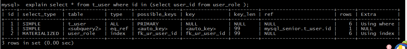 explain select * from t_user where id in (select user_id from user_role );