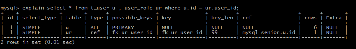 explain select * from t_user u , user_role ur where u.id = ur.user_id;